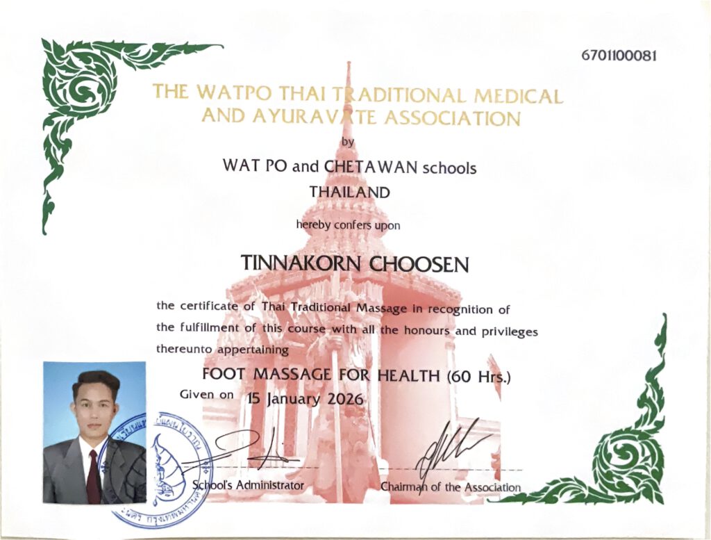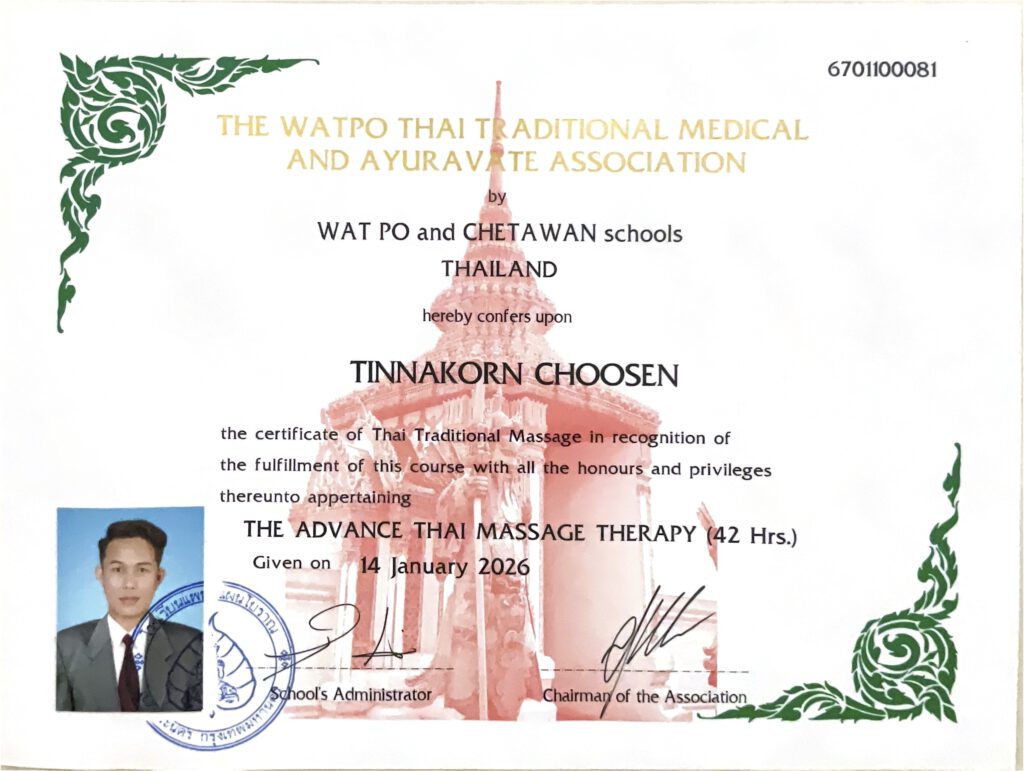 Meine Massageausbildung habe ich an der renommierten Massageschule Wat Po & Chetawan absolviert, die auch über Thailand hinaus einen großen Bekanntheitsgrad hat.